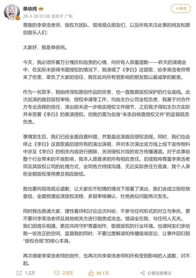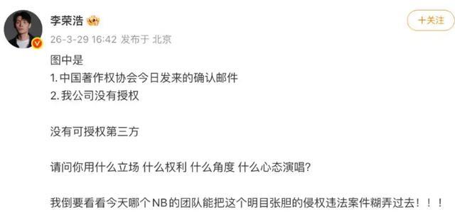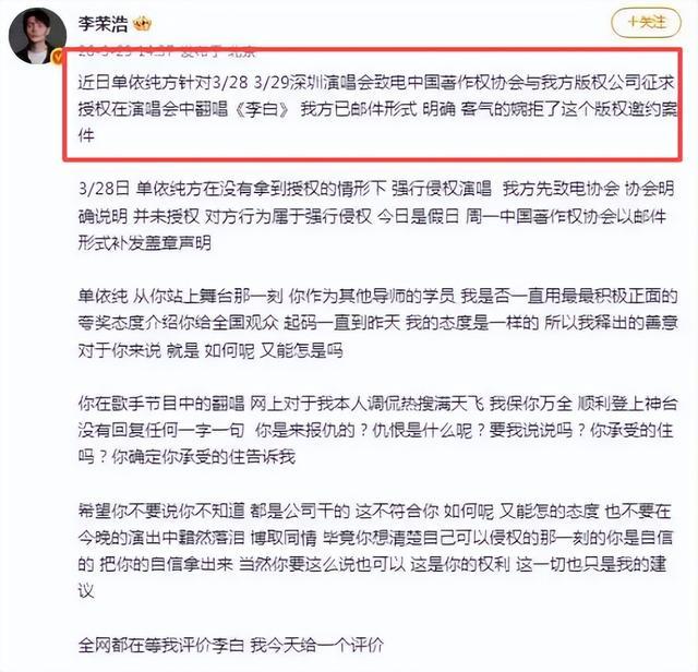 就在3月29日,李荣浩发文,直指单依纯侵权唱《李白》。