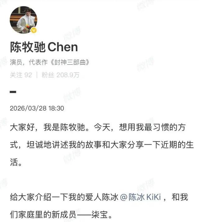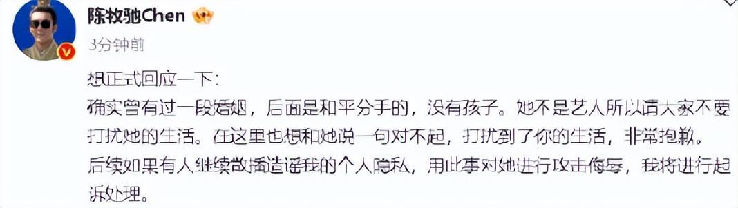 3月28日,演员陈牧驰在社交平台发布长文。