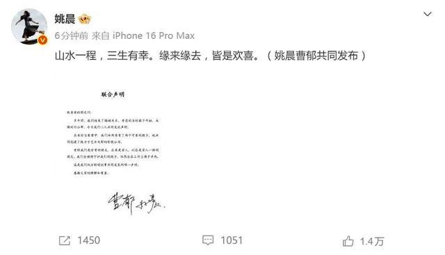 3月16日,姚晨和曹郁共发声明,昔日爱人已成前夫前妻。