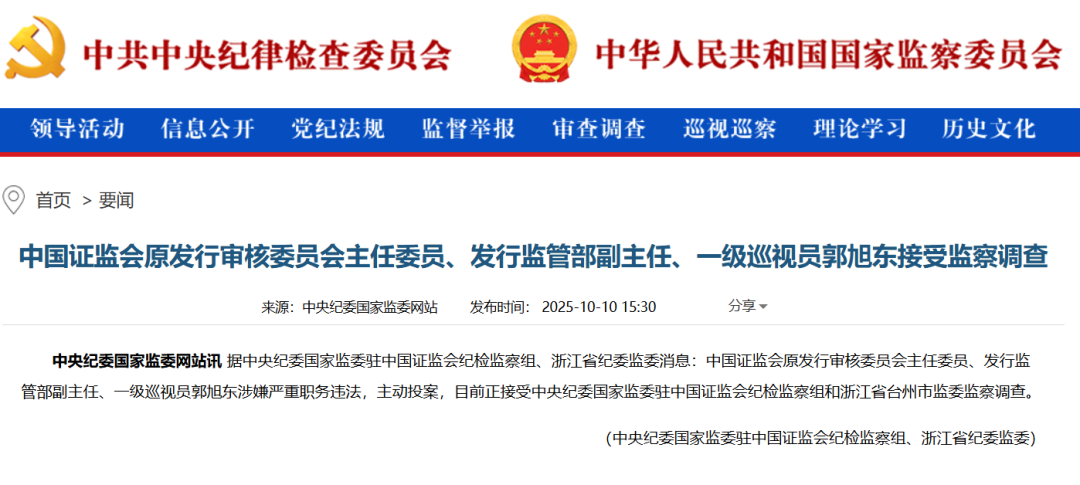 2025年10月10日,据中央纪委国家监委网站消息,中国证监会原发行审核委员会主任委员、发行监管部副主任、一级巡视员郭旭东涉嫌严重职务违法,主动投案,目前正接受中央纪委国家监委驻中国证监会纪检监察组和浙江省台州市监委监察调查。